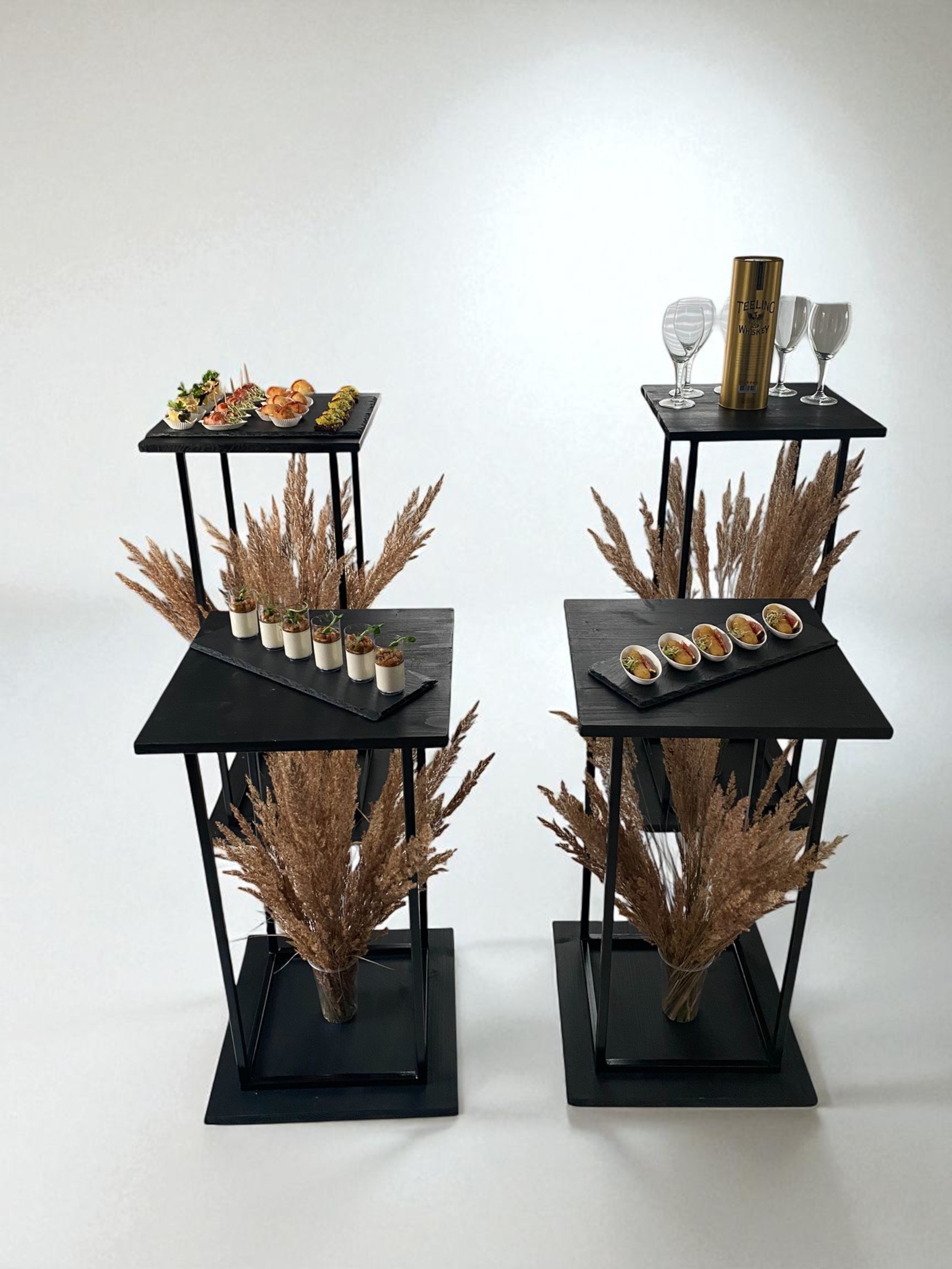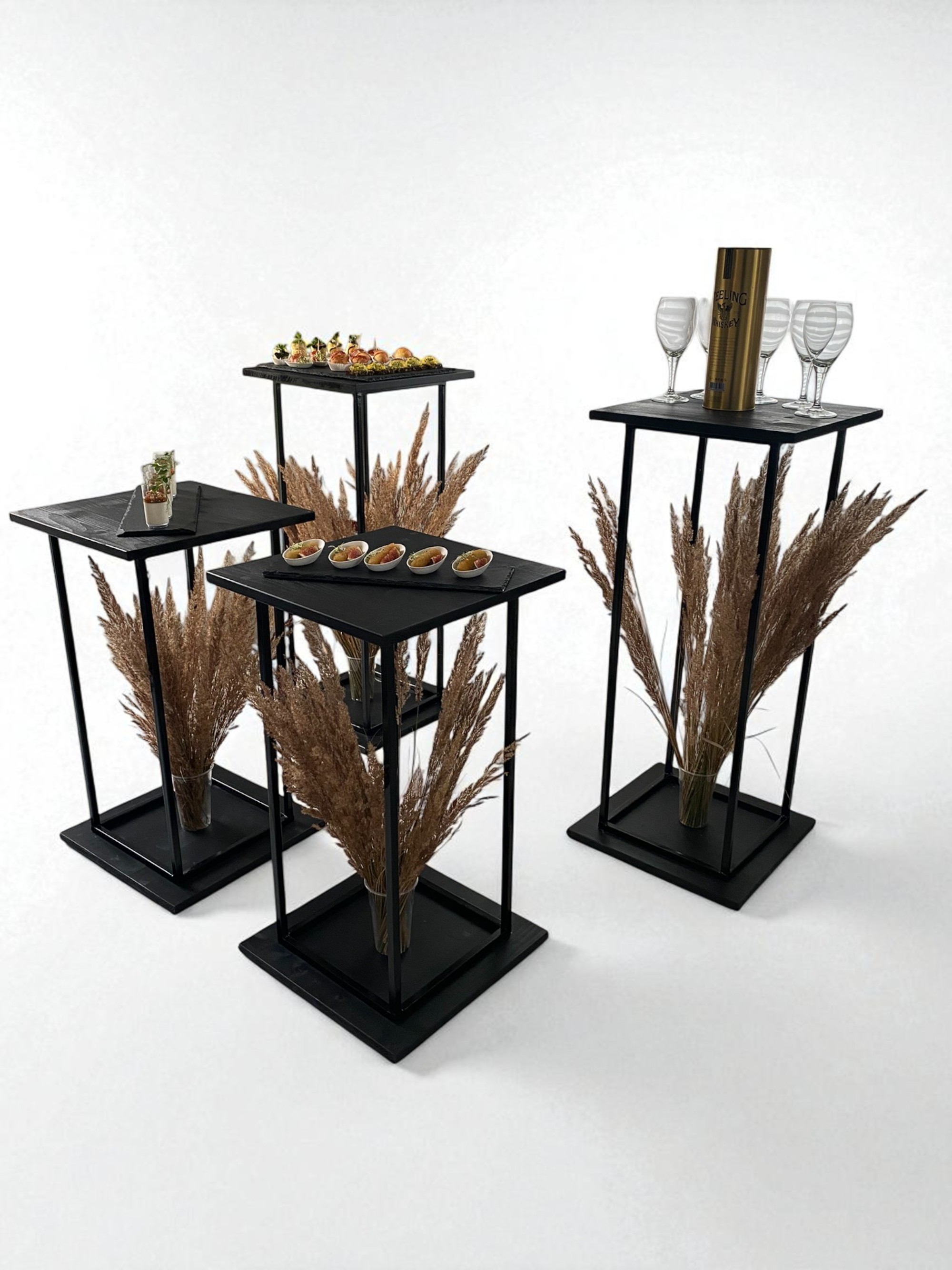 Metaliniai juodos spalvos stovai - rėmai - kolonos vieno kąsnio užkandžiams