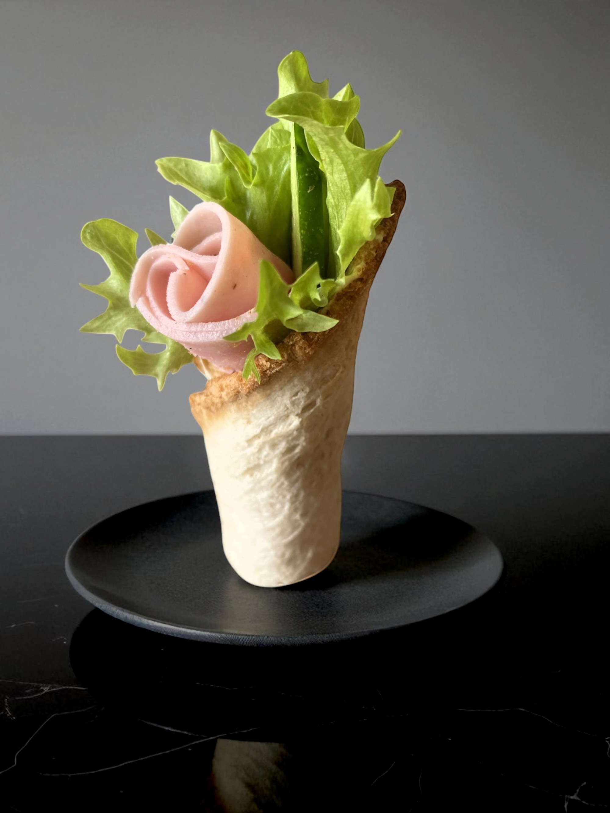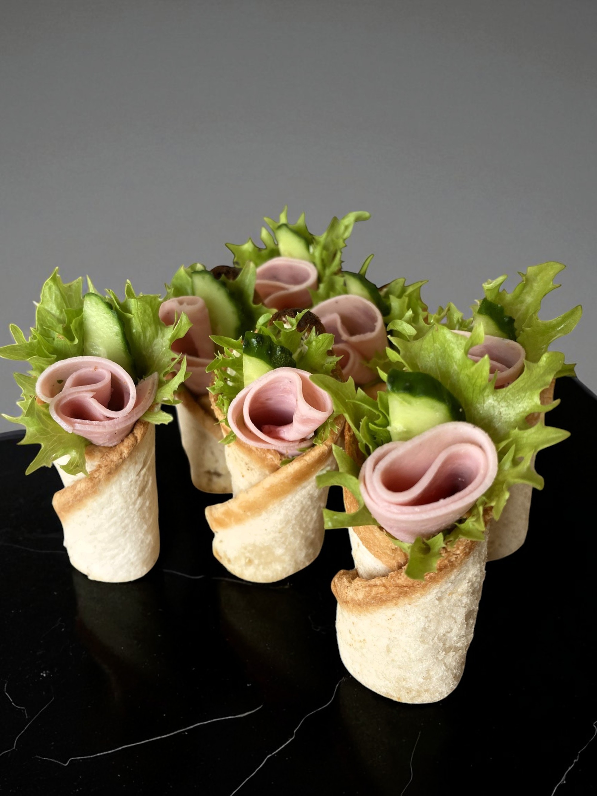 Traški duonos taurelė, pripildyta traškių salotų lapų, agurko juostelės ir elegantiškai susuktos mėsytės. Puikiai tinka šventei, verslo susitikimui ar kaip užkandis